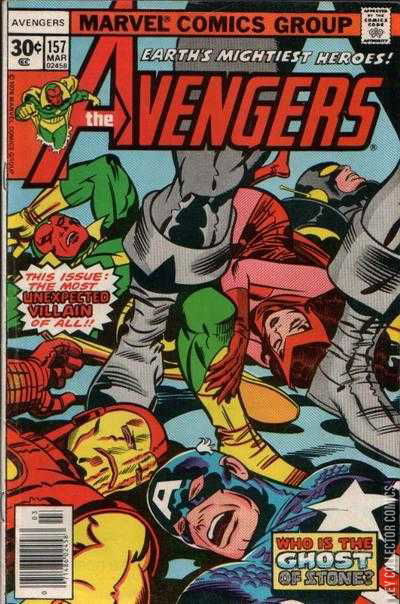 "A Ghost of Stone!" Iron Man, Yellowjacket, and the Beast are in the control room of Avengers Mansion when the wall is smashed by the stone statue of the Black Knight. The three heroes are subdued before they learn who their attacker is. The statue of the Black Knight explains that after months of being inert in the basement of Dr. Strange's Sanctum Sanctorum a strange being reanimated him, and since then he has gone on a mission to get revenge on those he believes responsible for his current condition: The Avengers. Going to the upper level of the mansion, it finds and defeats both Captain America and Wasp in battle. After the fight, it has a sudden recollection following the last encounter between the Avengers and the Defenders wherein the Black Knight was turned into stone, in that the group deduced that they were tricked into fighting each other by Loki the god of mischief. The Black Knight statue would soon consider the idea that the Avengers had abandoned him. Elsewhere, the Scarlet Witch is out with Wonder Man Christmas shopping. During their walk back to Avengers Mansion, Wonder Man prevents an out-of-control bus from crashing. They arrive at the mansion to find a ravaged Jarvis, who warns them of the Black Knight statue. It defeats both Wanda and Simon in battle. The Vision then shows up, and the Black Knight statue cannot hurt him due to the Vision's density powers. It forces the statue to remember the events wherein Dane Whitman sacrificed himself to save the Defenders from being trapped in the past, and that his soul had left its body and now inhabits the body of his 12th-century ancestor. Unable to accept this, the furious statue attacks the Vision once more. However, since the Vision had converted his body into the density of diamonds, the statue only succeeds in destroying itself, ending its threat.