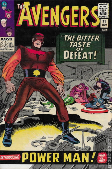 THE BITTER TASTE OF DEFEAT! Erik Josten, who worked as an agent for Baron Zemo before his death, returns to the machinery Zemo used to create Wonder Man. There he finds the Enchantress, who tells him she will use the machine to grant him super-strength as well. He agrees and is given the name Power Man. The Enchantress then creates a number of illusions around the city that make the Avengers seem dangerous when they accidentally destroy property and endanger lives. Captain America tries to subdue Power Man as he attacks men with important documents, only to find out that the men were impostors trying to steal them. Hawkeye, Quicksilver and Scarlet Witch are also caught with similar traps. The Avengers believe themselves to be nuisances and are ordered by the authorities to disband.