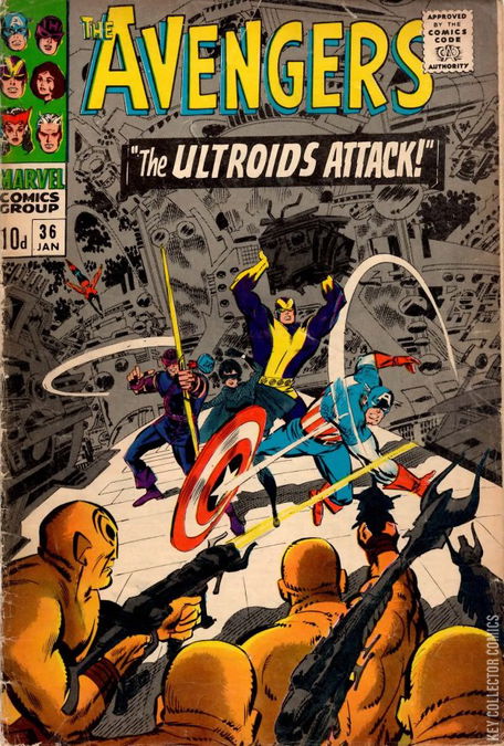 "The Ultroids Attack!" (Story continues from last issue) Captain America is surprised to find the Scarlet Witch in Avengers Mansion. She relates that Quicksilver has been kidnapped by a UFO. Elsewhere, Hawkeye nominates the Black Widow for membership, but Goliath objects on the grounds that the Avengers is not a "halfway house" for reformed criminals. A distress signal reaches the team. Despite Wanda's concern for her brother, Cap states that the Avengers must always concern themselves with innocent civilians first. Thus the Avengers (including the Scarlet Witch and the Black Widow) fly to the Balkans. There, they discover a huge computer named Ixar draining information from the village's Burgomeister. Ixar lured the Avengers to him in order to extract power use them to build the Ultroids. They also discover that the Scarlet Witch who accompanied them is a fake, she is in fact an Ultroid known as Ultrana. Ultrana and the Ultroids attack the Avengers, capturing them all. They are to be subjected to Ixar's experiments. Since the Black Widow is not an Avenger, she is sent to be destroyed.