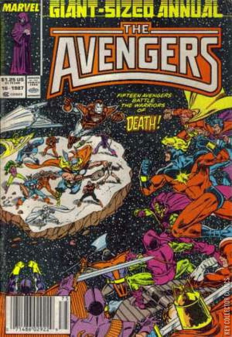 THE DAY DEATH DIED! As a result of the Contest of Champions, the Grandmaster had restored the Collector's life at the cost of his own. Once within the realm of Death, however, he schemed to conquer the final adversary. Now, after having pitted the West Coast Avengers against their eastern counterparts in Death's domain, he has distracted, then defeated Death itself. Bored with life, the Grandmaster has created five life-bombs which will cause a new "big bang," replacing the present universe with one of his own design. When the Avengers challenge him to a final game, he pits them against a new Legion of the Unliving composed of their deceased friends and foes. Thor, Hawkeye, and Dr. Pym battle the Executioner, the Swordsman, and Nighthawk in a fiery netherworld, where Dr. Pym is impaled on a stalagmite by Nighthawk and killed, while Thor defeats the Executioner but is killed preventing the life-bomb from exploding, leaving Hawkeye the only survivor of his group after he tricks the Swordsman using his trick arrows, electrocuting him. Meanwhile, Captain Marvel, Moon Knight, Tigra, and the She-Hulk face Drax the Destroyer, Death Adder, the original Green Goblin, and the Kree Captain Mar-Vell in a tropical setting. Tigra defeats Death Adder but is poisoned by him in the process, Moon Knight is killed by the Green Goblin, and She-Hulk has her back broken by Drax the Destroyer. Captain Marvel succeeds in defusing their bomb but her energy form is drained by the villains while She-Hulk and Tigra die on the beach below. The Silver Surfer and Korvac fight to their mutual destruction in space. In a misty alien wasteland Iron Man, Mockingbird, Dr. Druid, and the Black Knight face Dracula, Terrax, the second Red Guardian, and the original Black Knight. Iron Man defeats Terrax at the cost of his armor, while Mockingbird overcomes the Red Guardian. The two Black Knights are too evenly matched for either to win, while Dr. Druid and Mockingbird are both killed by Dracula, the latter distracting Iron Man from defusing their bomb, which detonates. In a Arctic waste Captain America, Wonder Man, and the Wasp combat Hyperion, Baron Blood, and Bucky. Hyperion kills Wonder Man by driving him through the planet into a nearby sun, while Captain America beats Baron Blood. The Wasp, suffering due to the extreme cold, is crushed to death by Bucky, who Cap defeats before destroying their bomb. Incredibly, only Cap and Hawkeye have survived the contest. Rather than undergo a second round with their late comrades added to the ranks of their foes, Hawkeye proposes a simple game of chance which the Grandmaster cannot resist playing. He proffers two arrows, daring the alien gamesman to guess which one has an arrowhead attached. When the Grandmaster loses, Death frees herself and exiles him from her realm, then returns all the Avengers to life on Earth. Captain America is astounded to learn that Hawkeye has cheated on the wager, by palming the arrowhead attached to the shaft the Grandmaster chose.
