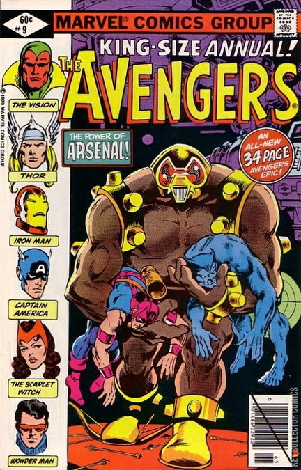 -- TODAY THE AVENGERS DIE! At the end of Iron Man 114, the powerful Arsenal disappeared without a trace. The Avengers meet to discuss the threat of Arsenal. Exploring, Hawkeye and the Beast discover a hidden complex beneath Avengers Mansion, even as their teammates learn that Arsenal has been discovered to be a forgotten secret weapon developed during World War II by Project Tomorrow, which was headed by Tony Stark's industrialist father. The project was located beneath the Stark family townhouse, now Avengers Mansion, where a newly repaired Arsenal has now captured Hawkeye and the Beast, whom it believes to be Axis agents. Invading the underground base, the Avengers battle both Arsenal and Mistress, the computer guiding its actions, until Iron Man reaches the inner computer chamber and frees the two captives. He then informs Mistress that the war is over and that Howard Stark is dead. The computer, its personality based on Maria Stark's brain patterns, self-destructs, even as Thor and the Scarlet Witch finally defeat the robot.