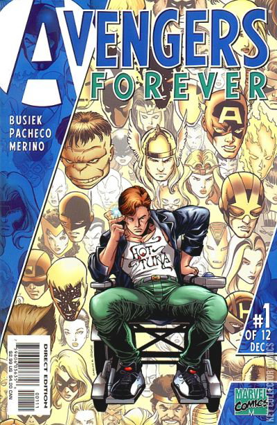 DESTINY MADE MANIFEST Opening on the distant planet, Beta Centauri IV in the 26th Century of Earth-9812, a dozen Centaurian rebels furtively haul crates of armaments through back alleys. Preparing to strike a spaceport, they are suddenly frozen in time and space. As the phenomena unfold planet-wide, multiple spaceships resembling Avenger Quinjets descend upon and destroy the cities. Deploying from the ships are squadrons of specialized soldiers based on Thor, Iron Man, Captain America and Ant-Man respectively, enacting a full-scale ground assault against the immobilized populace. The survivors awaken and encounter Jonz Rickard, commander of "Galactic Avenger Battalion Theta-4". As well as the might of his troops, Rickard wields a mysterious force to break the unsuspecting masses. Not far away, three robed alien figures stand in disapproval... Back in the present, another Quinjet arrives at a new research facility amidst the ruins of Blue City on the Blue Area of the Moon. Recently the scene of an Avengers' incident involving zealous alien militants, the team utilizes its clearance to bypass the S.H.I.E.L.D. and Starcore staff to gain an audience with the building's resident "prisoner", the Kree Supreme Intelligence. Given the extraterrestrial super-computer's familiarity with the energies permeating their suddenly-afflicted brother-in-arms, Rick Jones, the Avengers interrogate and uneasily concede to leave Rick under its watch for further study. As the heroes exit, the Intelligence has a brief yet ominous dialogue with a cryptic robed figure, skulking in the chamber's shadows. In Limbo, Immortus solemnly looks upon this unfolding scenario. Gesturing, he freezes time and space on the Moon, dispatching his giant henchman, Tempus, to execute Rick Jones in the space between moments. As the creature begins drawing the life from Jones's body, another force expectantly negates Immortus's doing, creating a localized pocket of restored free-flowing time. Rick's surprise protector stands revealed as Kang The Conqueror. Outraged by this interference, a heated exchange occurs between Kang and the projected form of Immortus wherein the Conqueror also destroys the time lord's massive lackey. However, Tempus being created from the very stuff of Limbo itself, only serves as a greater portal for Immortus's "Army of the Ages", spilling forth in countless hordes from his shattered remains. Arming himself, Kang wages a single-handed defense. Nearby, Rick stirs to consciousness as the Intelligence and its shrouded ally realize a prophetically crucial moment is upon them. With that, the robed figure traverses the battlefield, laying hands upon Jones, unleashing seven bolts of strange yet somewhat familiar energy from him[3]. Coalescing, these anomalies appear to be the forms of seven very confused Avengers...