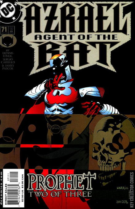 PROPHET PART 2 - BROTHERS Jeremiah Thompkins and the Faux-Azrael find Jean-Paul Valley along with Werley spread across the desert sand. The imposter drags both men to Jeremiah's home and restrains them. Jean-Paul begins to have a vision and imagines the actual Azrael. Azrael tells Jean-Paul that this imposter comes from an Asian sect of the Order of St. Dumas in Shanghai. Jean-Paul regains consciousness and hears a car pull up to Jeremiah's base. Jeremiah welcomes his buyer Mr. Cox and his bodyguards into his home. Mr. Cox presents Jeremiah with 300 thousand dollars in international bearer bonds for the stolen medical supplies. Jeremiah inquires about Mr. Cox's intentions for the medical supplies. Cox replies by saying that there are a lot of people dying in the Middle East and the Balkans. He intends to sell the supplies to whom ever can afford it and leave the rest to die. Jeremiah then gave the imposter a nod to execute the buyers. The imposter decapitates Cox and vanquishes Cox's bodyguards. Jeremiah and the imposter bury the bodies then head back to the base in order to interrogate their prisoners. Jeremiah recognizes Werley's uniform and assumes he comes from McGog's camp but Werley explains that he is only Jean-Paul's driver. Jeremiah asks Jean-Paul why he has come. Jean-Paul tells Jeremiah that he was asked by Leslie to bring Jeremiah home. Jeremiah doesn't believe that Jean-Paul knows his sister Leslie. Jean-Paul convinces Jeremiah by saying Leslie runs a clinic in the East End Docks of Gotham. Her heroes are Gandhi, Martin Luther King, Thich Nhat Hanh and Dorothy Day. Leslie carries a copy of Day's book in her purse and her only vice is eating a piece of chocolate each day and feels guilty about it. Jeremiah interrupts Jean-Paul when he goes on about Leslie's love of knock knock jokes and playing frisbee. Jean-Paul expresses Leslie's concerns for Jeremiah and Jeremiah cryptically says that she should be. Jeremiah orders the imposter to throw the prisoners into the storage shed until Jeremiah can reach a decision on what his next move is. The imposter leaves the prisoners with a flashlight and Werley takes advantage. Werley breaks the flashlight and uses the flashlight shards to cut through their duct tape bonds. Jean-Paul pleads with Werley to not provoke the imposter or Jeremiah but Werley ignores him. Werley drop kicks Jeremiah but he doesn't move fast enough to dodge the imposter's blade wielding gauntlet. The blade slits Werley's throat. Jeremiah tells Jean-Paul that he was going to set the two of them free and allow Jean-Paul to extend his warmest greetings to his sister Leslie but since Werley is dead, this will complicate matters. Jeremiah suspects that Jean-Paul will relay Werley's death to McGog and his mercenaries will try to kill them as retribution. Jeremiah orders the imposter to kill Jean-Paul but Jean-Paul attempts to reason with the imposter and the Faux-Azrael hesitates.