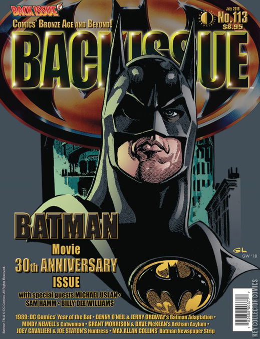 Back Issue celebrates Tim Burton's Batman's 30th Anniversary, featuring a guest column and interview with Batfilms producer Michael Uslan, an interview with screenwriter Sam Hamm, and a chat with the man who might have been Two-Face: Billy Dee Williams. Plus: 1989: DC Comics' Year of the Bat, Denny O'Neil and Jerry Ordway's Batman movie adaptation, Mindy Newell's Catwoman, Grant Morrison and Dave McKean's Arkham Asylum, Max Allan Collins' Batman newspaper strip, and Joey Cavalieri and Joe Staton's Huntress. Featuring a classic Michael Keaton Batman cover by Jose Luis Garcia-Lopez, with cover design by Michael Kronenberg.