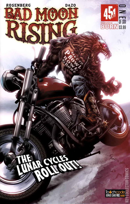 Written by Scott Rosenberg and Brandon M. Easton. Art and Cover by Ty Dazo. It's hell on wheels when Sherriff George Waggner is killed. His son Teddy returns home to discover that the small town has become victim to a rash of brutal murders. The investigation points to the nomadic motorcycle gang, the Lunar Cycles, that has set-up camp just outside of town. The arrival of werewolf hunter Noah Packard confirms that the bikers are more than they claim to be. Get ready for one wild and hairy thrill ride when the moon and the gas tanks are full and the townies and werewolves go to war to kick some serious werewolf butt in this wild and wooly smash up of The Wolfman and Sons of Anarchy. 32 pages, full color. Cover price $3.99.