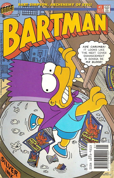 Bad guys beware! Bart Simpson, Archenemy of Evil, now has his own comic book! It's only the first issue, and already Bartman must face his greatest nemesis -- Mrs. Krappabel, and his greatest challenge -- summer school! Meanwhile, villainy is afoot in the world of Springfield's comic collectors! A mysterious criminal mastermind has hatched a nefarious scheme to artificially inflate the prices of enhanced-cover comic books! With the help of his trusty pal Milhouse, Bartman swings into action to battle this fiendish plot. Can the spiky-headed superhero foil the foil-stamping fiends? Find out this issue!It's Bartman, Man! (article about Bart by Matt Groening)The Comic Cover Caper! Bartmail (letters and fan mail)Bart's Bottom 40 (list of Bart's least favorite things)Bartman (poster : some issue variations do not include this)