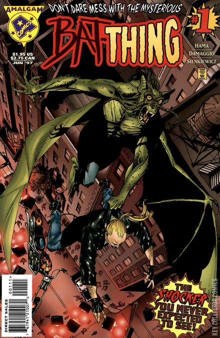 SOMEONE TO WATCH OVER ME In order to save two universes, the young hero known as Access was forced to use the power of Amalgam (see Marvel versus DC (1996) #3). In this issue, The macabre Man-Thing and the tragic Man-Bat are merged to create the Bat-Thing. This cursed creature is forced to stalk the night, seeking out evil wherever it may dwell.