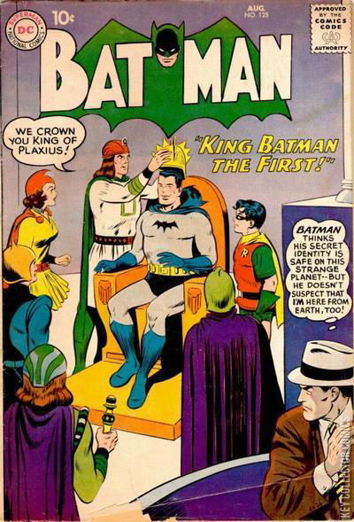 THE SECRET LIFE OF BAT-HOUND When John Wilker takes a job which will keep him traveling constantly, he asks Bruce Wayne and Dick Grayson to keep his dog Ace permanently, not knowing his dog is secretly the Bat-Hound. Soon after, Batman and Robin go on a mission against Mr. Midas, a masked criminal whose gang specializes in gold robberies. When he steals a solid gold car at an exhibition and scatters gold coins in his wake, pedestrians rush into the street and obstruct the Batmobile. Detective work leads Batman and Robin to Midas's hideout, an abandoned gold mine, but the villain traps them there with a cave-in after telling them he is about to "pull the Jason job!" Batman is able to signal Bat-Hound back at Wayne Manor via radio signal from Batman's boot to a receiver in Ace's collar. Ace, as trained, puts his head through a harness holding the Bat-Hound mask, summons Kathy Kane as Batwoman, and leads her to the source of the signal, where Batwoman digs out the heroes with a steam shovel. Batman and Batwoman deduce that "the Jason job" refers to a movie nearby being made of "Jason and the Golden Fleece," with a fleece made of real gold. When the four crime-fighters arrive, Batman, Batwoman and Robin defeat the gang, while Midas makes a break for it in his car. Bat-Hound gives chase, corners Midas at an airport, keeps him from reaching a plane, and holds him until Batman can arrive and kayo the master thief. Later, Bat-Hound receives a hug from Batwoman as his two masters look on, grinning. THE LAST DAYS OF BATMAN Batman and Robin are sent back to 17th century Venice to successfully verify that a painting reputedly done by the artist Verillo was indeed his work, and that museum curator John Kirk has not erred in purchasing it. But, when the time comes for their return to the present, Carter Nichol's time machine is struck by a bolt of heat lighting. Batman is returned to his time of departure plus one hour, but Robin is shot forward in time three days, and picks up a newspaper whose headline tells of Batman's death falling from a TV tower in Bay City while saving Robin from a villain named El Bolo. Desperately, Robin realizes that he may yet have a chance to save his mentor, if he can change history when he returns to the present. Nichols's machine, once repaired, retrieves Robin from the future, but he refuses to tell Batman about the headline, realizing his guardian would not be stopped from sacrificing his life for Robin. The heroes do encounter El Bolo twice, resulting in the bolo-wielding villain's escape each time. But, when Robin, acting on his own, is trapped by El Bolo on his TV-tower hideout in Bay City, a Batman-costumed figure swings toward them--and falls after his Bat-Rope is cut in two by El Bolo's bladed bolo. A reporter, seeing the fall, hurries to call in the story of Batman's apparent demise. But, seconds later, the real Batman swings onto the TV tower, having distracted El Bolo by a costumed dummy, and apprehends the villain with a bolo of his own. Robin reveals all to Batman, and they pass by a newsboy later who holds the erroneous report of Batman's death, more than slightly exaggerated. KING BATMAN THE FIRST Batman and Robin, on the trail of a criminal named Gurney, wind their way through underground caverns until they encounter a "time warp" that places them in another dimension (as it already has Gurney). Soon after, they find themselves in an athletic arena, where they overhear a crooked athlete named Rakk fixing a competition to ensure him victory. Batman enters the lists against Rakk and defeats him in two alien sports. Then, startling enough, he is unmasked and crowed king of Plaxius, the alien world--the objective of the competition. But Gurney, who has watched the contest, informs Rakk of their alien nature, and Rakk, declaring same to the officials, has Batman and Robin jailed on grounds of illegal alien competition. The heroes are freed from imprisonment by Selina, fiance of Rakk's rival, Vol, who has been abducted by Rakk. Batman, Robin, and Selina track Vol to Rakk's satellite castle, where they smash his defenses with a boulder taken from the weak gravity of Plaxius's moon, and Batman defeats Rakk in personal combat. They return with Gurney to Earth knowing that Gurney has recognized Batman's unmasked face during the coronation ceremony. But, when they return through the warp, neither Batman, Robin, nor Gurney can remember anything of their adventure, and Batman's identity remains secret.