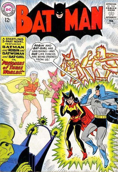 PRISONER OF THREE WORLDS On the trail of an alien who steals silver, Batman and Batwoman are split into their normal selves, which become drained of life-energy, and energy-selves who exist on another world, while Robin and Bat-Girl are sent to a different planet. On Earth, Batman and Batwoman try to find a way to merge back with their life-energy, but they are unable to find a solution. As they get weaker with time, they realize that they might not have much time left and both of them confess their true feeling for each other. In the meantime, their life-energies are confronted by strange creatures from another dimension, but once they help the creatures fight a monster, they stop the attack and leave Batman and Batwoman's energies alone. Robin and Bat-Girl have arrived to the home planet of the alien, who has been sent to Earth by a rogue scientist who needs the silver to create a powerful weapon and become ruler of his planet. Robin and Batgirl manage to escape and they go towards the authorities of the planet to let them know the evil scheme. On their way there, Robin saves Bat-Girl on several occasions, and after this, they share a private moment. When the authorities from the strange planet arrive to capture the rogue scientist, he decides to teleport himself to Earth and the young heroes take the chance to return as well. On Earth, Batman and Batwoman had managed to activate the machine that drained their life-energies and they are merged back with their missing energy just as Robin and Bat-Girl return along with the rogue alien scientist. The four heroes together capture the aliens and send them back to their planet before destroying the machine. As Robin and Bat-Girl go together for a walk in the park, Batwoman tries to get Batman to admit once again his feelings for her, but as usual, he manages to avoid a tight situation.