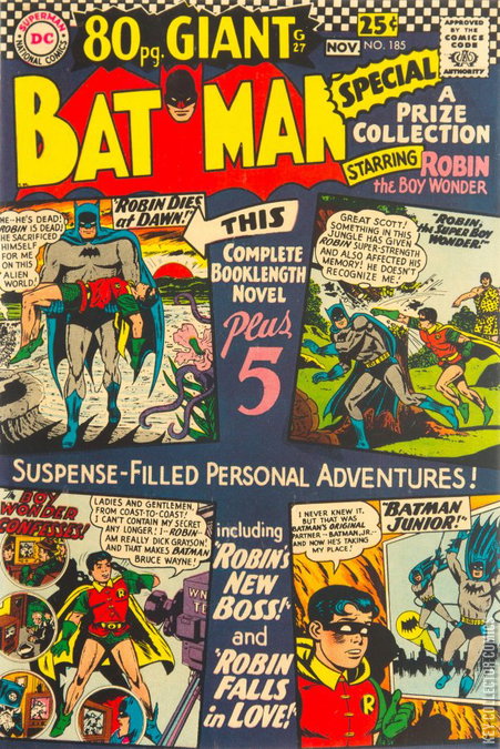 BATMAN, JUNIOR When Batman doesn't allow Robin to come with him on a case, and the Boy Wonder learns by accident that Batman had a partner before him, Batman, Jr. The real identity of Batman, Jr, is John Vance, who is currently working together with Batman to track down recently escaped gangster Birrel Binter. Out of frustration and sadness, Robin confronts Batman with the truth and he learns that Vance was Batman, Jr. for only one case, after which he never worked with Batman again until now. ROBIN FALLS IN LOVE Batman and Robin take in a rehearsal of the "Ice Capers" show they will make an appearance in for charity. While there, Robin swings down and rescues Vera Lovely, a beautiful teen-aged skater, from crashing into a ring of fire blown out of position by a fan. Vera insists on rewarding Robin with a kiss, which a photographer snaps a shot of, and Robin begins to fall in love--hard--for Vera. Batman points out that the photographer never took his lens cap off. The photographer, who had earlier remarked that he wanted to see Vera's first-ever pair of skates, was told by her press agent Paul Garvey that they were in a bank vault until they could be auctioned off at the performance for charity. Robin begins dating Vera, and begins cutting corners, on his crime-fighting with Batman. But Garvey, intent on following his boss's orders for a publicity romance, keeps Robin and Vera separated by various ruses so that she will be forced to go out with Roddy Dale, Miracle Pictures' latest teenage idol. Both Robin and Vera, misunderstanding, are less than happy. The night of the performance, Robin convinces Batman to show up an hour early to watch Vera skate. Batman notes the phony photographer again at the press box, finds out that none of the other pressmen know him, and describes him on the phone to the police. By that means, he learns that the man is actually Ben Keefe, wanted on suspicion of heisting $50,000 in jewels. The detective deduces that Keefe has hidden the jewels in Vera's first pair of skates. Keefe, disguised as a skater, snatches the skates away from their new owner after they've been auctioned and tries to escape across the ice, but Robin stops him by bringing a sandbag down and spilling it in his path causing him to slip and fall. Afterward, Robin and Vera get together, compare notes, and find out how they have been gulled, and the P.R. man repents his error. On their way home, Robin confides to Batman that he intends to keep his mind on crooks from here on in, not girls. ROBIN’S NEW BOSS Batman and Robin are scooped in their attempt to capture some thieves at an airport by Mr. Marvel, a new costumed crime-fighter, who uses futuristic gadgets and rides in a sky-car. In a press conference, Mr. Marvel says that he is a scientist and that he believes Batman's crime-fighting methods are outdated, as lawmen should not have to use fisticuffs. As Mr. Marvel continues to make headlines, Bruce Wayne notices Dick Grayson seeming to hero-worship the newcomer. Finally, Robin packs up and announces he is leaving to become Mr. Marvel's partner. Batman tries persuasion, which fails, and then tells Robin that can stop him from leaving as his legal guardian. Robin replies that he would have to reveal his Bruce Wayne identity in court to do so, and that, after a trial period, he will have his features changed by Mr. Marvel to start a new identity. The two heroes make a strained farewell. Later, Robin mulls over the real reason he has joined Mr. Marvel: to save Batman's life. Earlier, Marvel threatened to kill Batman if Robin did not become his partner, demonstrated his power by using a disintegrator ray-gun on a Batman billboard, and indicated that a device on his belt was tuned into "Batman's frequency" and would send a death-bolt to Batman if Robin did not team up with Marvel. Robin and Marvel continue their crime-busting, but Batman, recovering partially from the shock, suspects that Robin has not given him the true reason for his departure, and begins shadowing the pair. During another encounter with crooks, Robin breaks off the fight, slugs Mr. Marvel, and tears away his belt. Batman joins in the fracas and helps Robin put down the brigands, and afterwards, learns the truth from Robin. Batman braces Marvel and unmasks him, revealing Marvel as an alien. The alien confesses that he and his partner had long observed Batman and Robin from their hovering spacecraft, and that Marvel had made a wager he could acquire Robin as a partner for ten days. He confesses that his belt had no power to tune in on Batman's frequency, makes a lame apology, and is whisked back into his ship by his partner. Batman muses that Robin was only his partner for nine days, so Marvel has lost his bet. The two heroes head for home, reunited again. ROBIN, THE SUPER BOY WONDER! Batman and Robin trail escaped criminal Biff Warner to the Yucatan jungle, where Robin gains super-strength and amnesia from a freak effect of a lightning bolt and battles Batman under the instructions of a rogue Indian. Batman manages to escape Robin's wrath and soon he starts investigating the case. Batman learns that Robin is under the control of the rogue Indian, who is trying to lead the tribe against their chief. When someone tries to eliminate Robin, Batman saves the kid, restoring his memory. Batman then deduces that the rogue Indian is none other than Biff Warner in disguise and after the misunderstanding is cleared, Batman and Robin return to America with Warner as their prisoner after Robin's powers have faded. THE BOY WONDER CONFESSES! When Dick Grayson is late to school one morning, he is asked by his teacher why and he tells them that he was out catching a crook as Robin the Boy Wonder and to prove it, he performs all sorts of acrobatic acts in front of the entire class. The news reaches the press, who immediately make a connection between Grayson and Bruce Wayne as Batman and Robin. However, it is later revealed that everything is