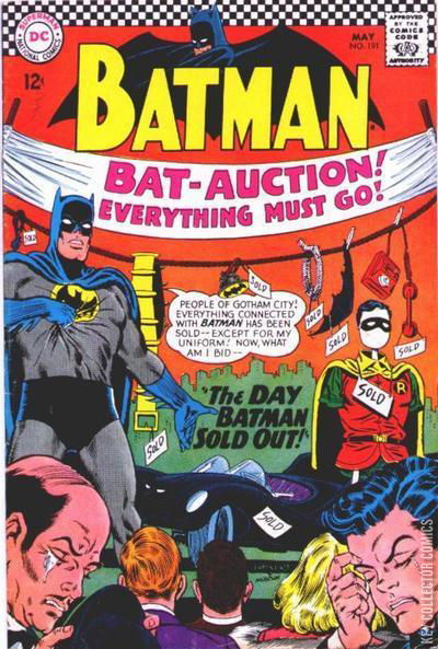 THE DAY BATMAN SOLD OUT! Batman has tracked down Ira Radon, a criminal who is responsible for stealing radioactive isotopes all over Gotham City. During their fight the Batman accidentally throws Ira into the nuclear reactor, an incident that Ira vows to get revenge against Batman for. Ira is horribly burned and is interned to a hospital bed, covered in bandages he is aware that he has been exposed to a lethal dose of radiation and that he will soon die, but not before he gets his revenge against Batman. Days later Batman calls a special newscast where he announces that he is retiring from crime fighting and that he intends to auction off all of his crime fighting gear including his. This comes as a shock to everyone, including Dick Grayson and Alfred who were unaware of the plan and are further surprised when Bruce admits it's all true. The very next day, there is a televised auction and all of Batman's gear is sold off. Watching the event from their prison cells, both the Penguin and Joker are upset that Batman has retired before they had a chance to get even with the Caped Crusader. Back in the Batcave, Batman takes off his uniform and reflects back on the events that led him to pulling this strange move: A number of nights ago while out busting up criminals, Batman noticed that his Batarang was briefly bombarded with a strange beam, examining it later, he realizes that someone had irradiated it. While out fighting crime while out on patrol, Batman would find that in each episode one of his tools, from his Batrope, to his Utility Belt, to even the Batmobile has been irradiated by this queer beam. Shining a detection light on the Batmobile, Batman finds that there is a message scrawled on the hood of his famed crime fighting car. The message is from Ira Radon, who is boasting over the fact that he has irradiated Batman's various anti-crime devices in order to force Batman to auction off all his crime fighting gear or risk Radon increasing the power of the radiation and kill Batman with radiation poisoning. However, Batman has come up with a clever plan on defeating Ira, adopting the alias of Andrew Kunkel, the only person at the auction who won that wasn't an employee of the Wayne Foundation. This arouses the curiosity of Ira who goes to visit "Kunkel's" home to see who would purchase a Batterang for $10,000. There, Ira is faced by Batman, who has protected himself in clay to protect him from Ira's deadly radiation. During the fight, the radiation intensifier that Ira threatens to use to kill Batman is destroyed, and Ira meets an ironic demise when he walks into the path of his own radiation bombardment device, kill him instantly. Resuming his Andrew Kunkel disguise, Batman phones the police. Later, back in his Batman guide, and with Robin, Batman explains to the press that he is back in action and explains the need for his deception toward the public. Later in the privacy of the Batcave, Batman explains to Robin and Alfred that the clay kept him safe from radiation while he used device from the Massachusetts Institute of Technology that aids the blind. With the radiation in his crime fighting arsenal neutralized, Batman and Robin go out on patrol once again. ALFRED’S MYSTERY MENU! While out on patrol, Batman and Robin come across a strange robbery: a gang of crooks that are attempting to steal high quality ingredients from the grocery store. After busting up the crooks, the two return home and soon become worried as Alfred had left earlier that day and has yet to return. Alfred has been kidnapped by Duke Kelsey leader of the Millionaire Mobster Club, who has kidnapped the fame butler because he wants him to prepare a millionaires meal for his gang. Alfred agrees to do the work, and gives Duke a list of ingredients he needs. Duke is completely oblivious to the fact that Alfred has made choice selections that will act as clues in order to tip Batman and Robin off to his fate and location. Realizing that the disappearance of Alfred and the strange theft must have a connection, Batman and Robin take Alfred's list of ingredients and go back to the grocery store to figure out specifically what the crooks had stolen in order to decipher Alfred's clues. Unfortunately, they find that shop keeper had cleaned up since the robbery, the only remaining evidence left is a pile of sawdust sweepings of the mess left behind. With it however, Batman and Robin manage to figure out the location of Alfred. They arrive just as the Millionaire Mobster Club is about to sit down for Alfred's prepared meal. With the help of their faithful butler, Batman and Robin manage to smash up Duke and his men and turn them over to the authorities. Afterward, back in their civilian guises, Bruce and Dick along with Aunt Harriet enjoy a nice meal prepared for them by Alfred.