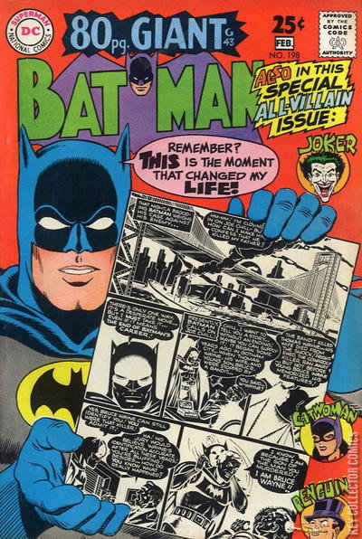 THE ORIGIN OF THE BATMAN! This story is reprinted from Batman #47. THE JUNGLE CAT-QUEEN! This story is reprinted from Detective Comics #211. THE WEB OF THE SPINNER This story is reprinted from Batman #129. COMPLETE SUNDAY NEWSPAPER SYNDICATED STORY The Penguin attacks a Post Office in order to retrieve a letter and he is confronted by Batman and Robin, who take the letter from Penguin. Batman then learns that the letter is addressed to Oswald Chesterfield Cobblepot and after reading the contents, Batman and Robin learn that is Penguin's real name. The letter was from Penguin's aunt, who was bound to arrive on a visit to Gotham City. Penguin didn't want to hurt the old lady's feelings by revealing his criminal activities and Batman decides to help him.Penguin, Batman and Robin take Aunt Miranda on a sightseeing tour of Gotham. Some crooks notice Penguin along with the Dynamic Duo and they assume that the crimelord has turned against them. As Penguin shows his "umbrella store" to his aunt, a large group of criminals arrives to teach Penguin a lesson, but they are all outmatched by the combined forces of Penguin, Batman and Robin, Aunt Miranda. When the criminals are captured, Aunt Miranda has to leave, still thinking that Oswald is an honest man and Batman and Robin make sure that Penguin is taken along with the rest of the thugs. THE CRIMES OF BATMAN! This story is reprinted from World's Finest #61. THE MENACE OF FALSE FACE This story is reprinted from Batman 113. THE BANDIT OF THE BELLS! This story is reprinted from Batman #55.