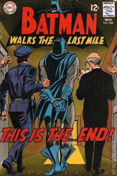 BATMAN WALKS THE LAST MILE! A new criminal mastermind, the Planner, holds court in a junk yard, concealed in the cab of a crane, picking up his "clients" in their cars with an electromagnet on the crane's arm and giving them detailed instructions for crimes they can pull--for a fee. His latest customers, a trio of rock musicians-cum-thieves, are tracked down and captured by Batman and Robin. For revenge, the Planner, aka E. G. Never, crashes a party held in Batman's and Robin's honor and claims to be the brains behind the two heroes. Never challenges them to a duel: when a big crime comes up, let Batman and Robin see if they can solve it without him, and if they cannot, turn the case over to Never. Since the next case turns out to be a "foolproof" crime planned by Never, Batman and Robin fail and Never naturally succeeds. On the second crime, Never gives a costumed thief, the Cat-Crook, a plan and gives him a TV alignment tool to drop in the robbery site. Batman and Robin pick up the "clue" and nab A. N. Tenna, a TV repairman whose only crime is padding his bill. Never "deduces" that the Cat-Crook is the culprit and captures the crook, making the heroes look bad in the eyes of the Police. Never then leaves in his car, knowing that Batman and Robin will trail him to the junkyard where he intends to shoot them both in "self-defense." But the Cat-Crook has heard Never's voice, deduces that he is the Planner, and, elbowing free of his guard, escapes and cycles over to the junkyard, intending to kill his traitorous "partner." In the darkness, Never mistakes the Cat-Crook for Batman and shoots him. Finally, Batman and Robin capture Never, bringing him to trial, and have him convicted of premeditated murder and other crimes. Never breaks down at the trial, shouting out that he is Batman and he is sentenced to death. As he walks to the electric chair some time later, he is granted his last wish: to die in a Batman costume.