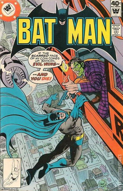 ONCE BEATEN, TWICE SLY! Batman and King Faraday trail Two-Face to New Orleans during Mardi Gras. The double-faced dastard himself is admitting two men, one American and one Russian, into his hideout aboard a restored paddle-wheeler to negotiate for the binary defense code. He tells them to return later, with $22,000,000 apiece, and then he will decide who gets the code by flipping his coin. After the men leave, Batman and Faraday break in, but are trapped by laser defenses as Two-Face escapes. Batman makes a fire with a phosphorus capsule, and some of the restaurant attendants break in to extinguish the blaze and free them. Tipped off by Two-Face's doodle of a crown on wheels, Batman deduces that their foe will hold court on a float in the Mardi Gras parade. Two-Face does so, receiving his two bidders, taking their $44,000,000, and flipping his coin--which he catches on edge. He activates jets in his chair and escapes to a blimp advertising Double Chew Gum. Batman and Faraday see him and manage to clamber aboard the blimp. Two-Face is about to stamp Batman's hands while the hero hangs from a hatch edge, but Batman insists he flip his coin first. Two-Face complies just as Faraday enters through a service hatch, fires, hits the spinning coin and knocks it through the hatch. Two-Face leaps after the coin, falls out of the blimp, and is lost to sight. Batman regrets Two-Face's loss, but tells Faraday that Two-Face took the code to the bottom of the lake with him, so Faraday should be happy. Faraday replies that he gave up the right to be happy when he took his job.
