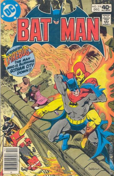 MY CITY BURNS AT BOTH ENDS-- IT WON'T LAST THE NIGHT! Batman rescues a girl from a burning tenement and notices a costumed figure atop the building. He swings back up to make contact with the villain, who introduces himself as the Firebug and shoots napalm from his fingertips to keep Batman at a distance. The Firebug thanks Batman for saving the girl as he claims the building has already taken too many lives. By the time Batman can staunch the fire with a foam pellet from his Utility Belt, the Firebug is gone. Later, while Bruce Wayne goes on a date with Selina Kyle, who suffers a strange headache and starts feeling a longing for her life of crime as the Catwoman, while elsewhere, Lucius Fox refuses Gregorian Falstaff's offer of employment. Meanwhile, the Firebug in his civilian identity of Joey Rigger, reviews the fate of his father, mother, and sister. All had been killed by defects in the tenement buildings they lived in. Joey himself went to Vietnam, where he was trained as a demolitions expert. He thus gained the know-how to fashion the weaponry of the Firebug, which he uses to burn down the buildings which took his family's lives. Checking with Commissioner Gordon, Batman runs down correlations on the two buildings the Firebug has torched, guesses that he is Joey Rigger, and finds from a magazine page in his deserted apartment that his next target will be the Gotham State Building. Batman confronts the Firebug at his next target, disarming a bomb and fending off his napalm with a fireproofed Batsuit. The battle carries them up to the observation deck, where the Firebug, in a suicidal frenzy, deactivates his costume's safety devices and lunges at Batman. The caped hero sidesteps, and the Firebug burns through the observation deck restraining fence, falling off the building. His napalm tanks explode seconds before he would have hit the pavement. At Gotham's Eternal Gate Cemetery, two English crooks break into a rich man's tomb looking for a buried treasure and finding the Gentleman Ghost.