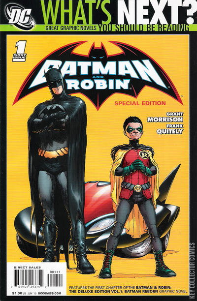 BATMAN REBORN, PART ONE: DOMINO EFFECT "Batman Reborn" begins here! With the reunited team of Grant Morrison and Frank Quitely ( ALL-STAR SUPERMAN , WE3 , New X-Men ), this first issue kicks off a 3-part story arc that can't be missed! The new Dynamic Duo hit the streets with a bang in their new flying Batmobile as they face off against an assemblage of villains called the Circus of Strange. They also tackle their first mission investigating a child who's been abducted by the mysterious Domino Killer. But will everything go smoothly? And who exactly are the new Batman and Robin?
