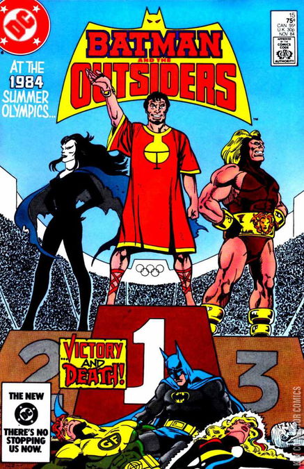 GOING FOR THE GOLD! Batman and the Outsiders have been challenged to a duel against Maxie Zeus and his New Olympians during the Olympic ceremonies. Each of the Outsiders is paired off against a different New Olympian for combat in a specified contest. Like this, he Outsiders bests their opponent, and in the meantime, Batman learns the ultimate goal of Maxie Zeus. After the Olympic games are finished, Batman follows Zeus to his home, where he learns that Zeus' main goal was to provide his daughter, Medea, a mother figure, reason why he kidnapped the Olympic athlete Lacinia Nitocris. When Zeus' explains himself, Lacinia agrees to take care of Medea and Zeus is willingly taken to the authorities.