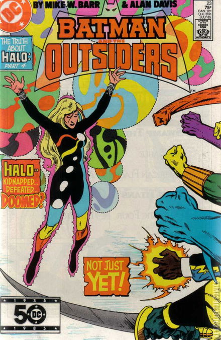 THE SEARCH FOR HALO Halo has been taken to the Aurakles dimension, where they will attempt to separate her human body from the energy being. Meanwhile, Batman and the Outsiders travel to Japan in order to retrieve the ancient ritual that could summon the souls of the victims slain by the Soultaker Sword. With the ritual, Katana summons the being of the Aurakle which was slain during their previous encounter in the destroyed Justice League Satellite. As a reincarnated being, the Aurakle is forced to obey Katana's command and she forces the light being to transport them all to the Aurakle dimension. The Outsiders arrive at the strange dimension and they confront all the other Aurakles, who are trying to harm Halo. At first, their efforts seem futile, but after a brief struggle, they manage to get the upper hand in the fight. Halo is then released by Black Lightning and then, Metamorpho transforms himself into a metallic cable, capable of conducting electric energy. As Metamorpho goes through the Aurakles, Black Lightning uses his powers to charge the cable and create an electric shock to defeat the Aurakles. Having lost the fight, the Aurakles are forced to let them leave, even though their quest for completing the unity has been thwarted. Back in the Wayne Foundation penthouse, Batman and the Outsiders are happy to become a full team once again, but Halo is still shocked after learning her origins and decides to spend some time alone to organize her thoughts.