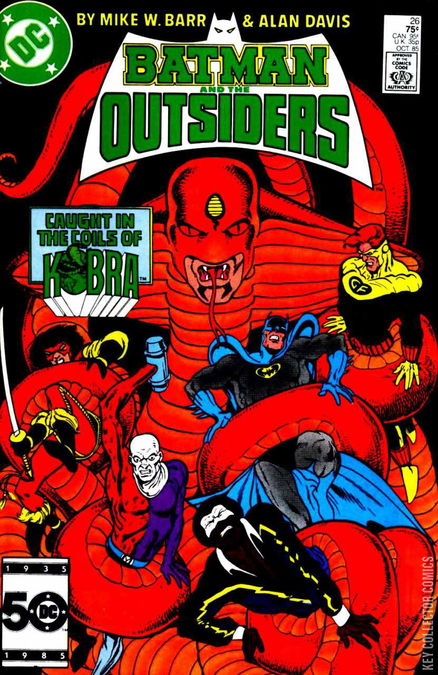 SERPENT IN THE SKY! Having learned the secret identities of the Outsiders, Kobra sends various members of the Kobra Cult to assassinate them in Gotham City. All of his agents fail and the Outsiders become aware of Kobra's activities. Knowing that the only member of the team that is unaccounted for is Halo, the Outsiders go looking for her and they find Kobra's hideout, only to learn that the villain has already moved out and taken control of the satellite defense program called "Star Wars System" and is threatening the United States Government with giving it to Soviet Russia if they don't surrender Fort Knox.
