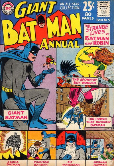 THE POWER THAT DOOMED BATMAN This story is reprinted from Detective Comics #268. THE MERMAN BATMAN This story is reprinted from Batman #118. RIP VAN BATMAN This story is reprinted from Batman #119. THE ZEBRA BATMAN This story is reprinted from Detective Comics #275. THE GROWN-UP BOY WONDER This story is reprinted from Batman #107. THE BEWITCHED BATMAN This story is reprinted from World's Finest #109. THE PHANTOM BATMAN This story is reprinted from Batman #110. THE GIANT BATMAN This story is reprinted from Detective Comics #243.