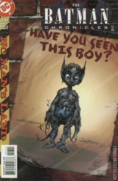 NO MAN'S LAND PART 27 LITTLE BOY LOST Francine Langstrom uses her son Aaron Langstrom to find food as he can smell meat and other products from great distances and he can also see in the dark, all because of the mutant genes inherited from his father. Langstrom is keeping some of the food found by her son to feed him and her daughter Becky; and some others she rationed among the people in her neighborhood. A couple of thugs spots the Langstroms and decides to gain some profit out of them. A man named Graff attacks Francine and kidnaps her son in order to sell the kid over to Penguin. Francine goes to see the Penguin but the man refuses to help her in any way. Batman notices the presence of Francine and forces the Penguin to tell him why was she there. After Batman is gone, Penguin ordered his henchmen to find and kill Graff. Batman learns about Francine's son and he goes to her home and offers his help but he discovers that she has already injected herself with the Man-Bat Serum. While she is transforming into the woman-bat creature, Batman asks where is her daughter, and Francine tells him that she is safe. Later, after the transformation is complete, Francine moves out to find her son and Batman follows. They go to the subway station were Graff is holding Aaron prisoner. Francine attacks Graff and the man runs away in fear. Graff comes across the Penguin henchmen and they kill him as their boss told them to. In the end, Francine and her son are reunited and are planning to leave the city and live free as Bat-people. Batman asks her what would happen to Becky and at that moment, Becky arrives also transformed into a woman-bat. Once together they leave Gotham. TURN ON, TUNE IN, FREAK OUT A man named Jenkin Yates is a TV show host that was trapped in Gotham after the earthquake and he decided to continue broadcasting his TV show with hope that someone would watch him. Batman and Oracle are aware of the man's program and they decide that the man could help save Gotham. Yates could broadcast the events and the lives of the people of No Man's Land as part of his TV show and it would be watched on national TV. The citizens of the United States of America watches the stories of the people inside No Man's Land and most are touched by what they watched. However, the TV Studio is being attacked by a street gang and Yates knows that his time might be over soon. Batman along with Oracle's help, goes to the studio and clears the street gang. Yates is shocked to see that the gang is gone and then he informs the national viewers that he will continue his broadcastings in the regular schedule. Oracle wonders if Yates' efforts will be useful sometime and Batman tells her that if just one man is touched by what they see, there might be hope for Gotham. At that moment a man in Washington, D.C. starts to make some phone calls after having watched the TV Show. IDENTITY CRISIS Batman is fighting Killer Croc when both of them fall to the ground from a tall building. Once on the floor, Batman is distracted by some noise behind him and Croc seizes the chance to grab the cowl and take it off. Batman knocks Croc before he can recognize him but the noise Batman heard earlier is caused by a man standing in the shadows nearby. The old man is named Patrick Kryder and he recognizes Batman as Bruce Wayne. Kryder met Bruce in a prom where they exchanged some ideas. Kryder was a former psychiatrist and he was assigned to treat Two-Face back in Arkham Asylum. Kryder was aware of Two-Face's obsession with Batman and after knowing the man's true identity, he thinks that speaking to Harvey about it would grant him some privileges in No Man's Land. Kryder goes to see Two-Face in order to give him the news and to gain something in exchange, but when he arrives, Two-Face has nothing but contempt for the man. Kryder tries to convince Harvey and tells him that he knows Batman's identity but Two-Face is not interested in knowing that, and after tossing his coin he kills Kryder and tells his henchmen to get rid of the body in the nearby dump. While they were doing that, Batman stops them and knocks them out. He recognizes Kryder from their past meeting and feels sorry for the man.