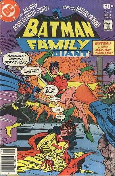 OLD SUPER-HEROINES NEVER DIE-- THEY JUST FADE AWAY! While trying to stop a robbery, Batwoman is attacked by one of the thugs with a special weapon, which fires a ray that incapacitates her. Upon recovering, Batwoman goes to Batgirl's appartment, but she dissolves into a pile of nothingness at Barbara's doorstep. Analyzing Batwoman's costume, Barbara recalls a similar chemical from her days as student and switching to Batgirl, she locates her old chemistry teacher, Professor Nu, who is currently working at Hudson University. While doing more research, Batgirl calls Robin to help them find a cure, and Dick is forced to lie to his girlfriend, Lori Elton, who seems to know more than Dick suspects. Robin and Batgirl are tasked by Professor Nu to find the origin of the virus that caused Batwoman's disappearance because it is highly contagious and would affect everyone who came in touch with with including Batgirl and Nu. Batgirl and Robin investigate the case and re-trace Batwoman's steps in order to learn whatever happened to her. They learn about the robbery that she tried to stop and following the clues of the crime scene, they find the carnival that Kathy owned. After interrogating a few members of the carny crew, Batgirl and Robin finally find the criminals responsible for Batwoman's disappearance and they take the criminals down, taking the virus weapon with them. Unfortunately, Robin was also infected by the virus and in order to reach Hudson University in no time, Robin calls his friend Kid Flash and has him take them back to Professor Nu, who develops a cure and restores everyone's normal state including Batwoman. The seasoned crime-buster is shocked after what happened and she promises to stay in retirement, while Robin resumes his student duties as Dick Grayson. CINEMATTACK! A movie-fanatic amateur "exorcist" is convinced that his neighbour is possessed by the devil, unaware that he is simply Man-Bat, and tries to destroy him. The man lures Man-Bat into a trap in his apartment and after he uses a series of make-shift weapons modelled after movie props, Man-Bat decides to use one of his Man-Bat pills to convince the exorcist that he's been cured.