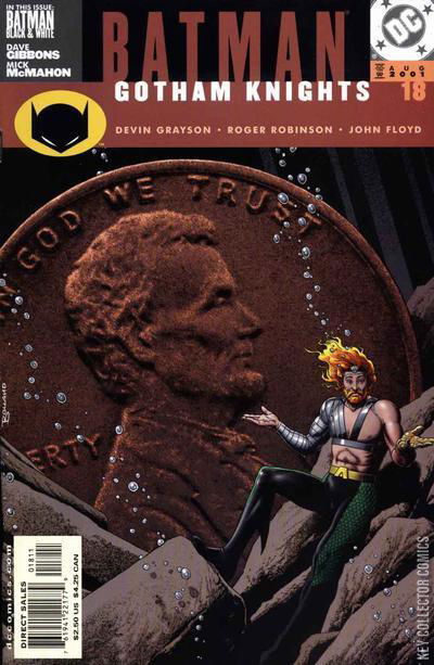 CAVERNOUS Batman is in the Batcave and accepts a call from Aquaman, who is on monitor duty in the JLA Satellite. Aquaman tells Batman its a slow night. Batman calls Oracle. Twice. He then checks with Dick Grayson to see how he is faring. He goes out on patrol, beats up some thugs and returns home to his empty mansion. Batman calls Aquaman and asks if he can help the caped crusader with something at the cave. During the earthquake, some artifacts fell underwater. Batman is hoping Aquaman can help raise some of them. Aquaman agrees and comes to the cave. Aquaman spends a good deal of time trying to lift a giant penny from an underwater crevasse, before realizing that Batman knew the penny could not be excavated. He was just looking for some company, due to loneliness. FAT CITY In the second story, a black and white feature, Batman uses the fattest woman in Gotham as bait to catch a killer who can bend his body to fit through drain pipes.