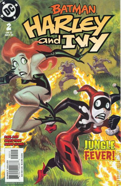 It's a rumble in the jungle as the miniseries by Paul Dini & Bruce Timm continues. Harley and Ivy hunt down the priceless Zombie Root in lawless Costa Verde, but will the homicidal loggers Slash and Burn bag them first? And can Ivy resist the siren song of the rainforest?Harley Quinn and Poison Ivy, after escaping from Arkham Asylum, continue Ivy's search for the Zombie Root, a rare plant in the Central American jungle country, Costa Verde. The only problem is that the country's corrupt president, Juan Ceballos, and industrial rainforest loggers get in their way.Costa Verde soldiers nab Harley and Ivy shortly after they set foot in the country. In a jail sturdy and rough police women, who are aware that Ivy's pheromones work only on males, brawl with Harley and Ivy. The quick thinking Harley again demonstrates her excellent hand-to-hand combat skills and defeats both of the brutal police women. Ivy then admits that her pheromones won't work on females, but her poisonous toxins work equally well on both males and females. The brawl stops when soldiers storm into the jail cell. They escort Ivy and Harley away at gunpoint.Costa Verde President Juan Ceballos greets Ivy and Harley. He learns from Harley that Ivy is planning to distill the Zombie Root. When Juan Ceballos demands to know the refining technique, Harley tricks him into getting close to hear the supposed secret. Harley suddenly grabs his tie and hurls him against Ivy's lips. Ivy's kiss causes Juan Ceballos to fall under Ivy's trance. He gives them an armed vehicle to drive through the jungle.As they drive through the jungle, Ivy warns Harley to drive carefully to avoid hurting the jungle plants. When Harley asks about the monkeys in the way of the Sport Utility Vehicle, Ivy shows no concern for the monkeys' safety.Ivy and Harley encounter two tough loggers who block their path. Ivy pushes a button on the armed car's dashboard and fires a Stinger missile, which explodes near the loggers. Harley drives away.Ivy...