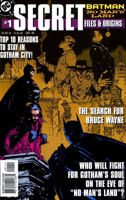 NO MAN'S LAND PART 74: THE MESSAGE A man called Jason Braun begins hearing voices after a bat bit him. The bat got inside his house after the earthquake and Jason was determined to leave Gotham City when the United States Government declared it No Man's Land. However, when he tried to leave, the voice in his head told him not to go. The voice in Jason's head is Gotham talking to him. The city tells him to deliver a message before midnight, when the bridges are going to be destroyed. The voice guides Jason to Oracle and asks her for the city's guardian angel. Before leaving, Jason tells Oracle that the city has a message for her; that she has served the city in that way more than ever before. On his way to the guardian angel, Jason comes across Penguin and his thugs. They try to steal from Jason but he runs away. A couple of Penguin's thugs follows him to Robinson Park. In the park, Jason stumbles into some branches and the thugs are about to catch him, when out of nowhere, Poison Ivy appears and kills the Penguin's henchmen. Jason sees the magnificent figure of Ivy and before she can harm him, he leaves the park. Jason is feeling bad and his vision becomes blurry. He arrives at the courthouse as Oracle told him. Two-Face reaches Jason and asks him what he was doing. Jason tells him that he is looking for the cemetery near the courthouse. Two-Face takes the man to the cemetery and Jason finally finds the crouching angel statue in the cemetery. He goes to it, but his condition worsens. Two-Face tosses his coin and is about to kill Jason when Huntress appears and stops him. Jason reaches the angel, but he is in a terrible state. Huntress approaches Jason to see if he is alright, but Jason sees Batman instead of Huntress. The voice in Jason's head then tells him that the city needs him and that he must not leave yet. Jason speaks those words to Huntress who got the message. After a while, Huntress asks Jason if he was bitten by an animal and Jason remembers the bat. Jason dies, but instead of leaving the city, his spirit joins the guardian angels of the city: thousands of shining bats. BATCAVES A brief tour through the many Batcaves around Gotham City for Batman and his Batsquad to gather and plan their next moves. These Batcaves where placed by Bruce Wayne during the time he was out of Gotham. DAY IN THE LIFE The chief editor of the National Inquisitor sent one of his employees to find and get an interview with Bruce Wayne after the closing of Gotham City. The girl looked for Bruce Wayne all around the world but in the end she was unable to find him. The National Inquisitor published a story about how Bruce Wayne was abducted by aliens. NO MAN'S LAND: THE ANIMATED SERIES Batman and Batgirl spot a suspicious man with a violin case in No Man's Land. The man is walking alone when he comes across some street gangs. They try to steal whatever is inside the case, but when the man opens it, there is just a violin. The thugs ask him to play some music for them and they are all delighted to listen to real music in such a long time. Batman and Batgirl are left speechless. Suddenly, a woman turns off the TV and tells her son to go out and exercise. The kid says that he would rather practice the piano. The mother is so surprised that she says that she would have expected Metropolis to become a No Man's Land instead of listening to her son speaking that way. TOP 10 REASONS TO STAY IN GOTHAM A list of ten points that make No Man's Land Gotham, a good place to stay. SENETE NO MAN'S LAND NOTES A folder with all the important files regarding Gotham City and the No Man's Land declaration. TIMELINE A description of the events of No Man's Land from January to December, in order. PROFILE PAGES Basic information of many important characters during the No Man's Land Crossover and pictures of them.
