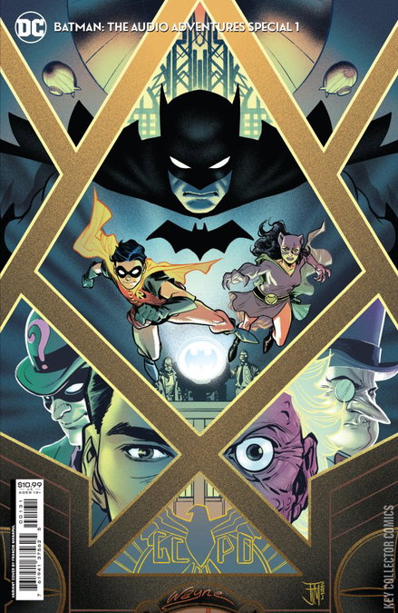 Ah, you hear that beautiful racket? That’s the music of Gotham City—the largest city in the world, the big gargoyle, the treasure of the night—anyone who calls it a crime-infested hellhole is dead wrong. No way hell has such great pierogies. So join us here (hear?) as we bring you the stories behind the stories behind the hit HBO Max scripted original podcast with this sensational prequel one-shot, written by the very creators and talent who lent their voices to the show. And unless you’ve been living in a cave, you know that after years of rumors we find out not only is the Batman real, not only is he one of the good guys, turns out, he’s gonna be a cop! With special appearances by King Scimitar, Stoveplate Sullivan, Billy Wristwatch, and others directly from the podcast, this oversize special brings you deeper into the mysteries behind Batman: The Audio Adventures!