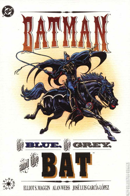 BATMAN: THE BLUE, THE GREY AND THE BAT is an Elseworlds tale in the historic tradition of BATMAN: GOTHAM BY GASLIGHT and BATMAN: MASTER OF THE FUTURE. This time, Batman is in the American West during the Civil War on a dangerous secret mission for President Lincoln. As he relentlessly pursues a threat to the Union, Batman, and his alter ego Bruce Wayne, encounter Samuel Clemens, Wild Bill Hickok and other luminaries of the Old West. His servant and friend, the ever-droll Alfred, makes his contribution to the action, as does the Bat-Man's Native American partner, Redbird.