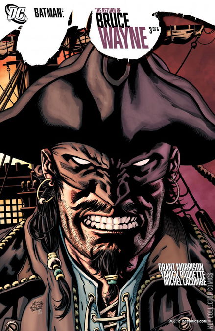 THE BONES OF BRISTOL BAY A memory unfolds - Darkseid's final showdown with Batman, and the Batman being struck with the Omega Beams. All of this comes with a single injunction: "Remember". On the shore of Bristol Bay, the dreaded pirate Edward "Blackbeard" Thatch has just sunk the ship of the vigilante known as the Black Pirate. Two men came out of the drink - a young man who won't speak, and a defiant black-haired fellow. Blackbeard rounds on the black-haired man, accuses him of being the Black Pirate, and demands that he take him to the fabled treasure of the Miagani, in the caves above Gotham Town. When the black-haired man says he is not the Black Pirate, Blackbeard pulls out the accouterments of the Black Pirate, which were also pulled off the ship. At the appeal of the young man, Blackbeard and the black-haired man agree to go to the caves. On the way, the young man, who introduces himself as cabin boy Jack Loggins, tells them that when the Pilgrims came over, the last of the Deer People joined their one-time brothers, the Bat-People, in the caves of Gotham. Blackbeard wonders at the possibility of ransoming Loggins, but the black-haired stranger shoots this down, pointing to the callouses on Loggins hands and the general state of his clothes. On the way down, the black-haired stranger notices the drawings he made, all those years ago. Loggins meanwhile recounts the lore of the perils they are soon to face: The Whistling Demon, The Breath of The Bat, The Bridge of Bones and The River of Night. Blackbeard tells him to shut up, but the stranger works out the first trap - a set of hidden people armed with darts, who aim by echolocation. Soon they reach the second trap: the Breath of the Bat - methane from dissolving bat droppings. The stranger orders them to douse their torches, but one man scuffs his shoe on a flint stone, causing a spark which almost kills them all. Meanwhile, in the present day, Batman and Robin are investigating in Blüdhaven. Wonder Woman has put the Justice League on Black alert - when Batman makes his way to the present, something terrible will happen. Red Robin recounts how the current Batman found the cape of the original in a cave, 11,000 years old by radiocarbon dating. A set of strange holes in the hood match to a brainwashing helmet in Command-D in Blüdhaven. The word is out - Batman is alive, and the world is doomed... Back in the past, Loggins corners the stranger, and admits that he is Jack Valor, grandson of John Valor, the original Black Pirate. Valor hands over the costume of the Black Pirate, but Blackbeard rounds on the two and wants to know what they are talking about. The stranger makes a grand show of falling into the river. They make the rest of the walk to the Bridge of Bones in silence. At the edge, they are attacked once by the darts of the Bat-People. And on the other side of the bridge, he appears - the Black Pirate. Blackbeard takes aim, but somehow misses, and the two men begin their duel in earnest. Meanwhile, the First Mate, Hands, grabs "Loggins" and crosses the Bridge of Bones. Just as the Black Pirate defeats Blackbeard, Hands puts up the shout - surrender or the boy dies. However, within seconds of the challenge, two of the pirates are dead by Miagani darts, leaving only Blackbeard and Hands. The Black Pirate demands that the two retreat. Then Jack Valor introduces the Black Pirate to the last of the Miagani Tribe. They recognize him, and let him into the most sacred part of their cave, which is guarded by a statue of their patron spirit, "the Lord of Night and the Dark Sun", who is supposed to guard them against the day they call the "All-Over". At the back of the cave is the cape of the Lord of Night - the cape that Batman was wearing when he came back in time. The Black Pirate is struck by his memories. At dawn the Black Pirate emerges from the cave with Jack Valor. Jack explains that he inherited the "Black Pirate" identity from his grandfather, and is unsure if he will continue with it. As an eclipse starts, the Black Pirate hands back the cloak and gives Jack the task of telling the Wayne family of Gotham what happened this day, as well as a commandment before disappearing: "Don't ever stop fighting." Blackbeard was reported hanged two months later. According to Jack's diary, he continued with the Black Pirate identity for many years, saving lives, including the woman who became his wife. They moved to Philadelphia and he left the costume behind. However, he did not visit the Wayne family until years later. They took his diary and placed it in a capsule, along with something he swore never to tell another living soul about. And yet, though Valor did his duty, he felt on the way back as though something terrible would one day rise from his actions... By the late 19th century, a group of Gotham criminals had incurred the ire of the caped mystery horseman. So they hired the deadliest gunman in the Americas to defend them: the man known as Jonah Hex...