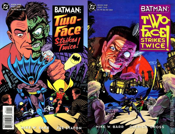 Flip-Book - Batman and Two-Face face off against one another across the decades in BATMAN: TWO-FACE STRIKES TWICE. This special 'flip-book' miniseries contains two related encounters between Batman and his duality-obsessed adversary, Two-Face, with two exciting covers on each issue! The stories in BATMAN: TWO-FACE STRIKES TWICE are presented in two distinct styles, with the first half of each issue a tribute to the Batman stories of the Golden Age, adopting the classic style of that era to chronicle one of the Dark Knight's earliest encounters with Two-Face. On the 'flip side' of each issue is a sequel to the Golden Age tale, set in the present day and directly related to the earlier story.