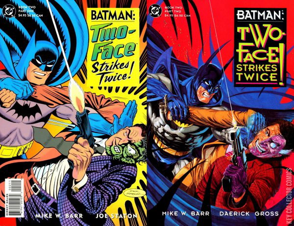 Two-Face Strikes Back epitomizes this Batman villain's character in its very format. It's a set of two graphic novels, published as a flip-book. One side gives a classic Two-Face story drawn in the style of the Golden Age. The other is a more contemporary tale featuring modern, painted art.