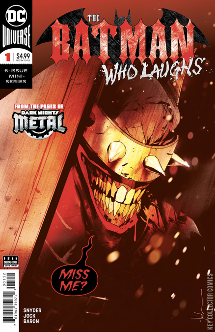THE LAUGHING HOUSE, PART 1 “A Batman who laughs is a Batman who always wins.” Left rattled by the events of DARK NIGHTS: METAL, Bruce Wayne must come face to face with the nightmares spawned from the Dark Multiverse. But even though evil devoured evil in the collapse of Challengers Mountain, the Dark Knight still has his doubts. He discovers that the Batman Who Laughs not only survived the fight with The Joker at the end of METAL, but now he is enacting a sinister plan across the Multiverse—something both terrifying and oddly familiar. But when Bruce Wayne realizes the only way to stop this madman is to kill him, he must consider violating the very rule Batman won’t break…the same rule that created this insatiable villain—the Batman Who Laughs!