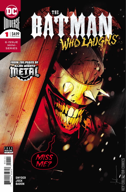 THE LAUGHING HOUSE, PART 1 “A Batman who laughs is a Batman who always wins.” Left rattled by the events of DARK NIGHTS: METAL, Bruce Wayne must come face to face with the nightmares spawned from the Dark Multiverse. But even though evil devoured evil in the collapse of Challengers Mountain, the Dark Knight still has his doubts. He discovers that the Batman Who Laughs not only survived the fight with The Joker at the end of METAL, but now he is enacting a sinister plan across the Multiverse—something both terrifying and oddly familiar. But when Bruce Wayne realizes the only way to stop this madman is to kill him, he must consider violating the very rule Batman won’t break…the same rule that created this insatiable villain—the Batman Who Laughs!