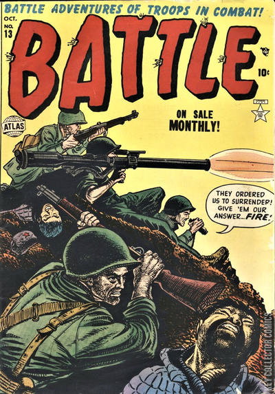 Home / Marvel / Battle / Battle #13 Marvel Released October 1952 Battle #13 Add to Collection Want It Synopsis No synopsis available. Issue 13 of 70 Add to Collection Buy it on eBay Buy on eBay Low $15 Mid $45 High $150 Synopsis No synopsis available. Details Series Battle Cover Date October 1952 Pages N/A UPC N/A Cover Price N/A Final Order Cutoff N/A Creators No creators listed. Price Guide Log in or subscribe to access detailed graded price information and market insights. Log In Subscribe