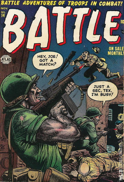 Home / Marvel / Battle / Battle #14 Marvel Released November 1952 Battle #14 Add to Collection Want It Synopsis No synopsis available. Issue 14 of 70 Add to Collection Buy it on eBay Buy on eBay Low $25 Mid $75 High $250 Synopsis No synopsis available. Details Series Battle Cover Date November 1952 Pages N/A UPC N/A Cover Price N/A Final Order Cutoff N/A Creators No creators listed. Price Guide Log in or subscribe to access detailed graded price information and market insights. Log In Subscribe