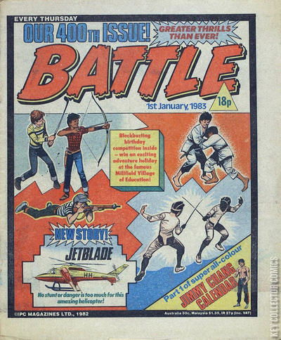 Home / IPC Magazines / Battle / Battle #1 January 1983 400 IPC Magazines Released January 1983 Battle #1 January 1983 400 Add to Collection Want It Synopsis No synopsis available. Issue 3 of 116 Add to Collection Buy it on eBay Buy on eBay Low $1 Mid $2 High $3 Synopsis No synopsis available. Details Series Battle Cover Date January 1983 Pages N/A UPC N/A Cover Price N/A Final Order Cutoff N/A Creators No creators listed. Price Guide Log in or subscribe to access detailed graded price information and market insights. Log In Subscribe