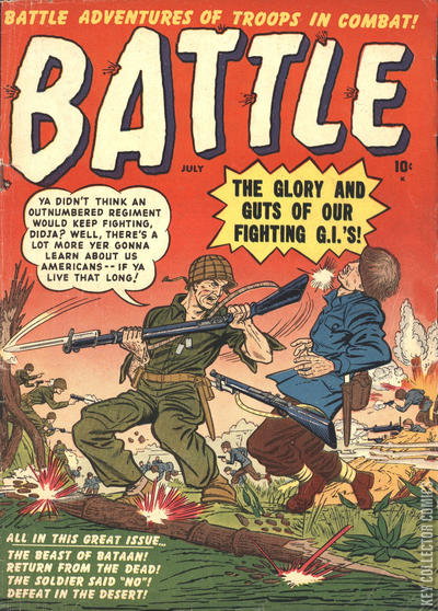 Home / Marvel / Battle / Battle #3 Marvel Released July 1951 Battle #3 Add to Collection Want It Synopsis No synopsis available. Issue 3 of 70 Add to Collection Buy it on eBay Buy on eBay Low $12 Mid $35 High $120 Variants Canadian Synopsis No synopsis available. Details Series Battle Cover Date July 1951 Pages N/A UPC N/A Cover Price N/A Final Order Cutoff N/A Creators No creators listed. Price Guide Log in or subscribe to access detailed graded price information and market insights. Log In Subscribe