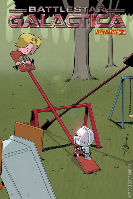 MEMORIAL Part 2! In celebration of the 35th anniversary of the original Battlestar Galactica TV series, Dynamite's brand-new Battlestar Galactica series continues! Issue #2 is written by cosmic supremos, Dan Abnett & Andy Lanning (Legion, Nova, Guardians of the Galaxy) with artist, Cezar Razek (Classic Battlestar Galactica, Vamarella vs Fluffy) and legendary cover artist Alex Ross. Issue #2 finds Apollo and Starbuck lost in time and space after a brutal Cylon attack on the Galactica resulted in a temporal explosion that consumed the battlestar and whipped it from the timeline. Now they have to find a way to return home in a reality where the Battlestar Galactica never existed and the Cylon's rule supreme.