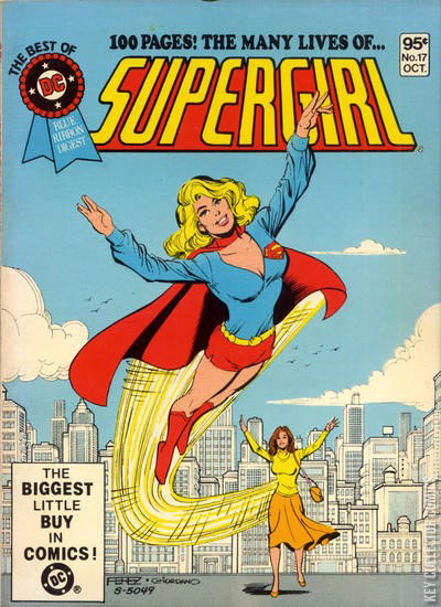 The Many Lives of Supergirl. Cover by George Perez & Dick Giordano. "The Great Supergirl Mirage" by Otto Binder & Jim Mooney. "The World's Greatest Headline" by Jerry Siegel & Jim Mooney. Superman app. "The Infinite Monster" by Jerry Siegel & Jim Mooney. "Supergirl Goes to College" by Jim Mooney. Super-Monkey, Super-Horse app. "Crypt of the Frozen Graves" by Steve Skeates, Tony de Zuniga & Bob Oksner. "Trail of the Madman" by Cary Bates, Art Saaf & Vince Coletta. "Princess of the Golden Sun" by Elliot S. Maggin, Art Saaf & Vince Coletta.