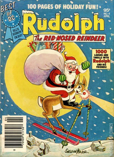 Cover art by Sheldon Mayer. Christmas Magic!, The Land behind the Sky Holes! Will a Stitch in Time Save Christmas?; story riginally intended for the 1978 Rudolph the Red-Nosed Reindeer tabloid which was cancelled in the DC Implosion of 1978. The Secret of the Lucky Dragon Egg! All scripts and pencils by Sheldon Mayer, inks by Tenny Henson. All stories star Rudolph the Reindeer.
