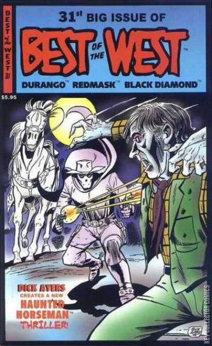Cover by Dick Ayers. Featuring: The Haunted Horseman in the new story "The Curse of the Carpathians," written by Bill Black and drawn by Dick Ayers. Reprints: Stories by unknown. Art by Bill Walton, Dick Giordano, Vince Alascia, Frank Bolle, Fred Meagher and Fred Guardineer. Featuring: Black Diamond in "Six Gun Showdown"; Rocky Lane in "The Nester's Treasure"; Tim Holt [Redmask] in "The Men Death Wanted"; White Indian [Straight Arrow] in "The Boy From Back East"; The Durango Kid in "Trail of the Sawbones"!