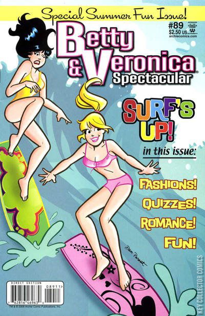 Get set to wax up your board and ride the waves in this surf-tacular issue! When a reality show about a hunky surfer hits Riverdale, guess which rich girl is first in line to be an extra? Rainy days don't put a damper on Betty and Veronica's surfing - not when they can "surf indoors" with their interactive "Whee" gaming system! Plus, summer fun fashions and quizzes!