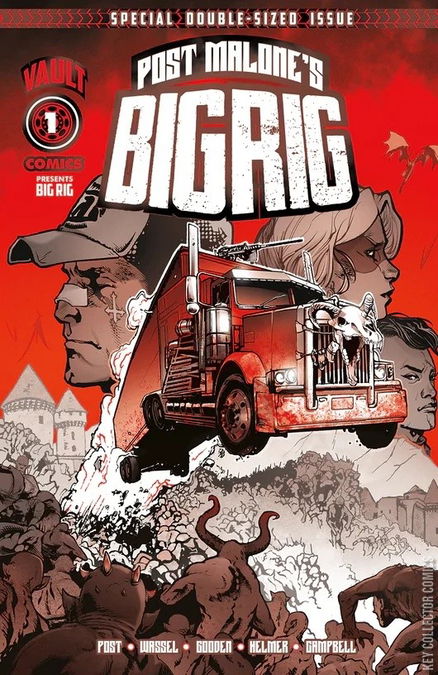 Double-length — collects chapters 1 & 2! Post Malone’s BIG RIG. THEY PRAYED FOR A MIRACLE. THEY GOT 25 TONS AND 18 WHEELS OF HOLY WEAPON. The Dark Ages…Demon hordes plague Europe as Hell invades Earth. The Six Petals, a secret sect of The Knights Templar, are in desperate need of a means to drive back the scourge and turn the tide of the onslaught. What crashes to earth is The Rig, a fully loaded tractor trailer. In the aftermath of its arrival, the only man left standing is an enigmatic former priest excommunicated from The Six Petals. He will become Trucker and lead the fight against Hell behind the wheel of a demon-slaying machine. Created by Post Malone. Written by Post Malone and Adrian Wassel. Drawn by Barbaric co-creator and Dark Knights of Steel artist Nathan Gooden.