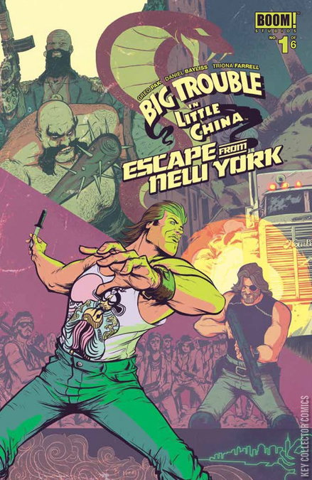 'It's the mother of all crossovers as Jack Burton and Snake Plissken meet for the first time ever anywhere!' Done with director John Carpenter's complete blessing, witness this melee of the mullets as two cult classic characters made famous by actor Kurt Russell crossover in an improbable adventure. As lightning cascades around Jack and his good ol' Pork-Chop Express, he finds himself transported and driving through the horrors of what seems to be the dystopian future of...Escape from New York.. Snake Plissken catches wind of Jack and goes on the hunt to find who is trying to steal his identity. Prepare for the road trip of a lifetime, with Jack and Snake rumblin' down the streets of a dystopian future to find what craziness caused Jack to jump through worlds. Written by Greg Pak (Totally Awesome Hulk, Action Comics) and illustrated by Russ Manning Award nominee Daniel Bayliss (Kennel Block Blues, Translucid).