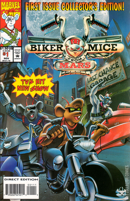 The three issues is an adaption of the first episode, "Rock 'n' Ride".(Note: Sometimes, the comic book will differ from the cartoon. I will point these part out as I go along.)The Biker Mice from Mars are crusing the solar system in their spaceship, which looks like a giant, red motorcyle. Throttle is steering --the controls (3 of them) look like the handlebars of motorcycles-- with Modo relaxing on his left, and Vinnie standing on his left, leaning agasint a wall, his arms crossed.(Note: In this issue only, Vinnie --who is suppose to be white-- is colored yellow, probibly for blonde. In the other two issues, Vinnie is white.)The three are talking about the war on Mars, and Vinnie tells the others that he misses the action.Just then, their ship --A Cycladrone Thunderpipe-- is hit by a purple, shark-like Plutarkian ship.(Note: The Plutarkians on board call the Mices' ship a Martian Cycladrone Cruiser, but on the show, they call it a Cycladrone Thunderpipe.)Vinnie fires at the Plutarkian ship --by leaning out of the door and shooting a hand cannon. But the enemy ship fires again, and knocks the weapon out of Vinnie's hand and knocks Vinnie back into the ship. The Plutarkians fire again, and the Thunderpipe heads for a crash landing on Earth.The Mices' ship crashes into the Wriggly Stadium scoreboard in Chicago. The Mice mount their bikes and crash out of the scoreboard. They first land in the ballfield, then head for the exits.In the corridor Vinnie has choosen, he comes across a teenaged punk robbing a hot dog vender with a gun.(Note: In the cartoon, it was a crowbar.)Vinnie, riding hard toward them, snatches the gun from the punk's hand. He tosses the weapon into the air, then zaps it with a laser on his bike. This scares the punk, and he runs off. The vendor thanks Vinnie, and the white Mouse rides off to rejoin Throttle and Modo.(Note: In the cartoon, the vendor gives Vinnie a hot dog. Vinnie rides off, but returns and asks in a British accent, "Pardon me, but do...