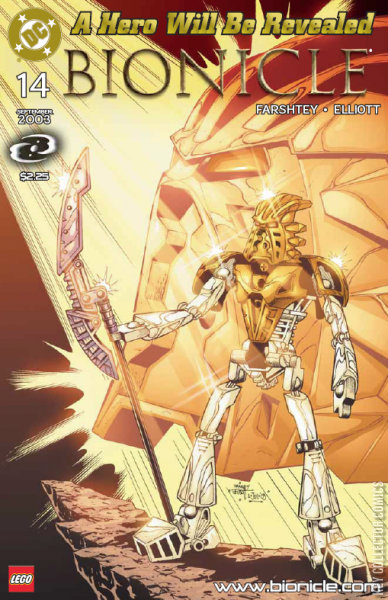After being trapped last issue Tahu Nuva, Gali Nuva, and Lewa Nuva burst out of their rocky prison and come to the aid of Kopaka Nuva who is standing alone against all six Rahkshi. At the same time Pohatu Nuva and Onua Nuva followed by Turaga Whenua escape the cave they were trapped in. United together once more the Toa Nuva are able to drive off the Rahkshi. The Rahkshi, controlled by Makuta Teridax, resume their prime directive of hunting for the Herald, Takua. A few panels are spent depicting the action from Bionicle: Mask of Light. The Toa arrive at Kini-Nui temple where the Rahkshi have gathered around the Herald and his companion Jaller. They are seconds too late and Jaller is killed, but they don't hesitate to bring the fight back to the Rahkshi, as the Toa fight a losing battle Takua finds it in himself to put the Mask of Light on and become Takanuva Toa of Light. He has no trouble despatching the Rahkshi and, using the Kraata from the Rahkshi's shells he constructs a vehicle to search out the Master of Shadows.This is the point where, for continuity's sake the watching of Bionicle: the Mask of Light is required, as the ensuing story does not exist in comic form. The comic plot line resumes after the end of the movie