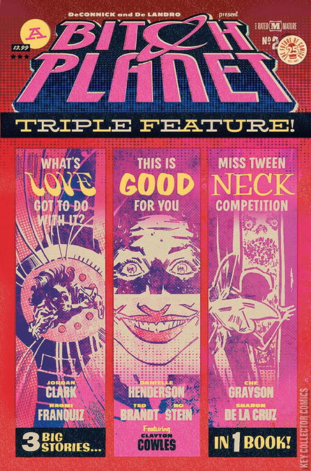 DECONNICK & DE LANDRO PRESENT: The Triple Feature! Patriarchy beware…this sci-fi kidney punch can’t be stopped! Return to BITCH PLANET for more tales from a world gone upside down…that might just be around the corner… Plus all the backmatter you can handle! 100 percent Grade A satire. Tell your friends. Tell your enemies.